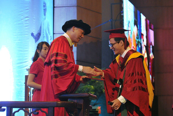 來自同一學院的博士畢業(yè)生曾衍瀚,拄著拐杖上臺,校長關切地詢問了情況。曾衍瀚笑著說:“得到校長的問候,很感動,覺得校長挺平易近人。”