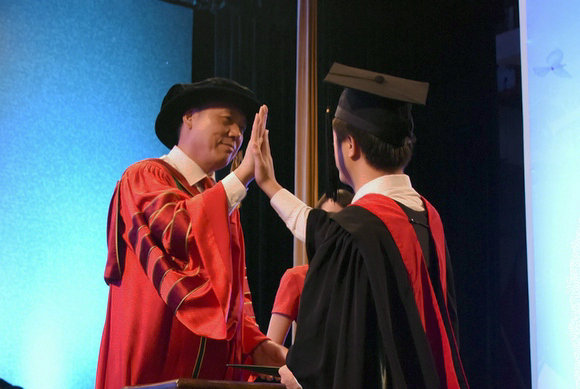 信息科學與技術學院本科畢業(yè)生湯超俊走上臺,對校長說“Give me five”,希望校長給予他力量,校長很爽快地答應他,配合了擊掌。下臺后,他仍難掩激動之情:“這是我人生中獨一無二的十秒!”