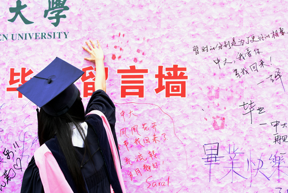 在畢業(yè)留言墻上留下我的掌印,一如在中大的校園里留下我深深的足跡(楊天益 攝)