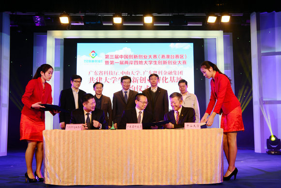 決賽期間,我校與廣東省科技廳、廣東省粵科金融集團共同簽署了《共建大學生創(chuàng)新創(chuàng)業(yè)孵化基地協(xié)議書》。根據(jù)協(xié)議,共建大學生創(chuàng)新創(chuàng)業(yè)孵化基地的建設目標是,采取省校共建的模式,發(fā)揮中山大學學科優(yōu)勢和人才優(yōu)勢,以開放、共享、協(xié)同為基本要素,匯聚政府、高校、社會等多方資源,建設集創(chuàng)意培育、創(chuàng)業(yè)實訓、創(chuàng)新孵化為一體的大學生創(chuàng)新創(chuàng)業(yè)活動基地,探索建立具有新型孵化器特征、適用于高校創(chuàng)業(yè)教育的制度體系。