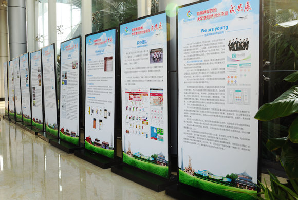 決賽場(chǎng)外,擺放著各參賽創(chuàng)業(yè)團(tuán)隊(duì)的產(chǎn)品簡介大板