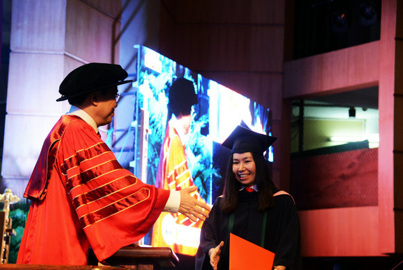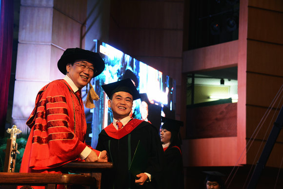 在觀眾席上,有許多父母用殷切的目光注視著主席臺(tái),等待自己的孩子上臺(tái)的那一刻,佛山的朱先生就是這眾多父母中的一個(gè)。他特意請(qǐng)假趕來(lái)中大參加兒子的研究生畢業(yè)典禮,見證兒子和校長(zhǎng)握手,完成畢業(yè)儀式。對(duì)此,朱先生感到格外自豪。