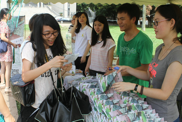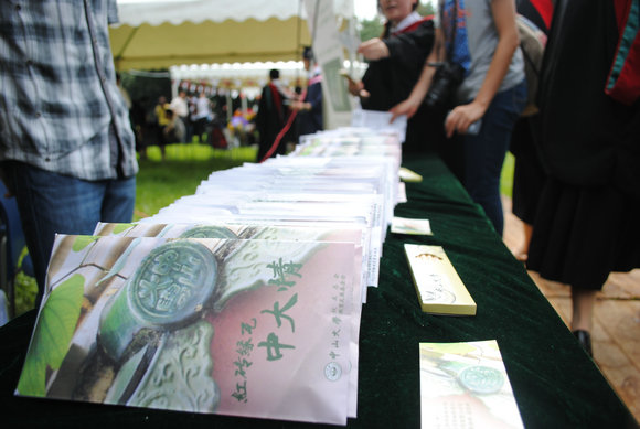 在這個(gè)季節(jié)里,對(duì)于他們來說,有太多的感動(dòng)、太多的收獲,其中,就有來自學(xué)校校友總會(huì)、教育發(fā)展基金會(huì)的一份精心制成的小禮物。畢業(yè)典禮前,校友總會(huì)、教育發(fā)展基金會(huì)便將制作好的一萬多張禮物領(lǐng)取券分發(fā)到各院系,由各院系派發(fā)到每一位畢業(yè)生手中。畢業(yè)典禮期間,畢業(yè)生可以憑領(lǐng)取券,至永芳堂前嘉年華現(xiàn)場(chǎng)免費(fèi)領(lǐng)取一份小禮物,即一套“青木?校訓(xùn)鉛筆”和一個(gè)“紅綠?瓦當(dāng)信封”。每位畢業(yè)生領(lǐng)完禮物后,領(lǐng)取券上會(huì)用打孔器打個(gè)孔,并系上彩色絲帶,就變成書簽了,既環(huán)保又實(shí)用還有創(chuàng)意。化學(xué)與化學(xué)工程學(xué)院畢業(yè)生陳傳森領(lǐng)到禮物時(shí),非常激動(dòng):“超級(jí)喜歡校訓(xùn)鉛筆!都舍不得用,因?yàn)橹荒茴I(lǐng)取一份呢。”