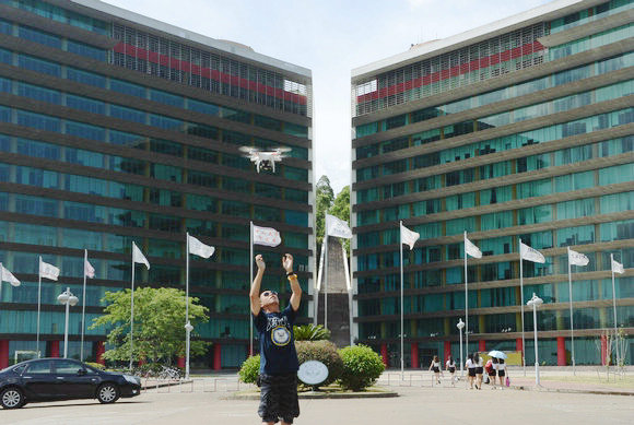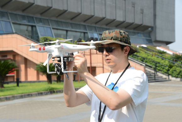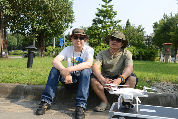 “記得第一次試飛是在南校區(qū)中區(qū)草坪,緊張得冷汗熱汗直冒,把整件衣服都濕透了?!睏顒貞浀?。第一次試飛,遙控技術(shù)還很有限,比較生疏,擔(dān)心飛行器撞上建筑或樹木而墜落,更怕墜落后傷到人;害怕它受信號干擾無法成功返航而“失蹤”……覃東駿感嘆道:“操控這個不僅需要一定的技術(shù),更需要一點(diǎn)天賦。因?yàn)檫b控器難以精細(xì)操作,需要手、眼、腦的充分配合。而且,想要拍出好看的航拍畫面,需要即懂得飛行也要懂得攝像才行?!苯?jīng)過幾次試飛航拍,他們已經(jīng)能較為準(zhǔn)確地控制飛行器的航向了,但仍無法確保萬無一失,每次飛行,依然緊張。