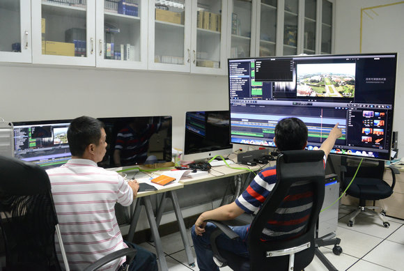 覃東駿、楊劍正進(jìn)行航拍視頻的后期處理
