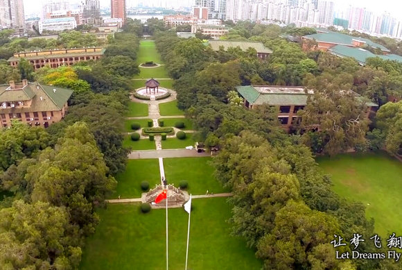 每次航拍前,必須設(shè)計(jì)好路線和方式。飛行器僅有四塊電池,每塊電池大概能飛十五分鐘,而每塊電池充電需要約一個半小時。每次整裝出發(fā)航拍,都必須在四塊電池耗盡前拍完需要的所有畫面。因此,以怎樣的方式航拍,在飛行器耗完電之前需成功返航的前提下,每塊電池完成哪些建筑和景物的航拍,這些都需要認(rèn)真而周密的設(shè)計(jì)。《讓夢飛翔》航拍中大視頻中,主要采用了由下而上拔地而起、由上而下俯拍、飛掠、“刷鍋”(即繞著航拍對象外圍掃拍,形象地稱之為“刷鍋”,編者注)等方式;拍攝對象選取,多為校區(qū)的核心景觀道或區(qū)、主要教學(xué)樓或區(qū)、醫(yī)院樓、宿舍樓、飯?zhí)玫取:脚牡哪闲^(qū)中軸線、北校區(qū)紅樓、珠海校區(qū)圖書館連接教學(xué)樓、東校區(qū)小谷河教學(xué)區(qū)、八家附屬醫(yī)院的標(biāo)志性建筑……都十分震撼!