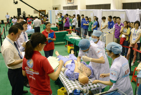 時(shí)間與質(zhì)量的平衡問題,是全國高等醫(yī)學(xué)院校大學(xué)生臨床技能競賽的一大難點(diǎn)。為期兩天的總決賽涵蓋內(nèi)科、外科、婦產(chǎn)科、兒科、急診科、麻醉科、眼科、皮膚科、耳鼻喉科、病理科、影像科等128項(xiàng)臨床技能操作及相關(guān)知識點(diǎn)。本屆總決賽共設(shè)置5輪賽道競賽,每輪25至30分鐘,內(nèi)含站點(diǎn)4至5個(gè),操作復(fù)雜程度不等。對該難點(diǎn)的探索亦貫穿于中大參加全國高等醫(yī)學(xué)院校大學(xué)生臨床技能競賽的五年歷程中:2010年,中大代表隊(duì)首次赴京參加全國賽,由于過于注重操作的細(xì)致,影響比賽速度,第一輪即被淘汰;2011年,中大代表隊(duì)經(jīng)過針對性的艱苦訓(xùn)練再次赴京參賽,以總分第一的成績一舉奪得第二屆全國賽特等獎(jiǎng);2012年,中大代表隊(duì)在北京蟬聯(lián)第三屆全國賽冠軍;2013年,第四屆全國賽移師京外,于中南大學(xué)舉行,中大代表隊(duì)再次問鼎冠軍;今年,第五屆全國賽在中大舉辦,中大代表隊(duì)再下一城,喜獲“四連冠”。