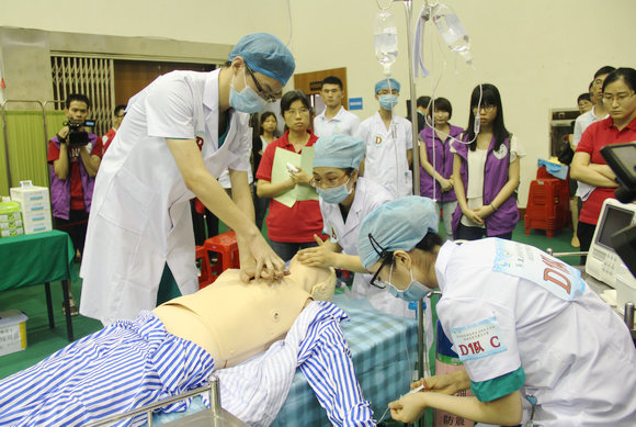 綜合病例環(huán)節(jié),中大代表隊(duì)隊(duì)員們正搶救一名青霉素過敏性休克、心跳驟停的“患者”