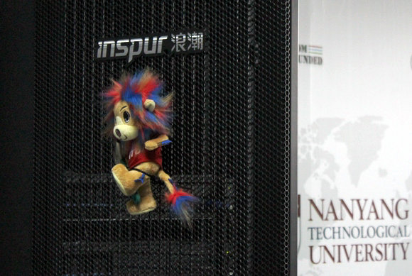 新加坡南洋理工大學(xué)首次參加國(guó)際大學(xué)生超算競(jìng)賽,在初賽中以海外總成績(jī)第一而挺進(jìn)總決賽。新加坡的多元文化成就了國(guó)際化的參賽隊(duì)伍,隊(duì)員們分別來(lái)自新加坡、印度、中國(guó)、越南等國(guó)家。在機(jī)柜上,一只身著“NTU”服飾的毛絨獅子玩偶默默支持著神色緊張的隊(duì)員們。原來(lái),獅子是南洋理工大學(xué)的吉祥物,獅子玩偶也是從校徽上的獅子演變而來(lái)的,隊(duì)員開玩笑說(shuō)“獅子已經(jīng)從?;丈系乃哪_行走進(jìn)化成兩腳站立了”。