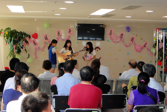在洪蘇金老師的鼓舞下,現(xiàn)場另外一位老先生登臺獻(xiàn)唱了歌曲《愛拼才會贏》,并與志愿者合唱歌曲《千千闕歌》,向在座的人傳遞了滿滿的正能量。
