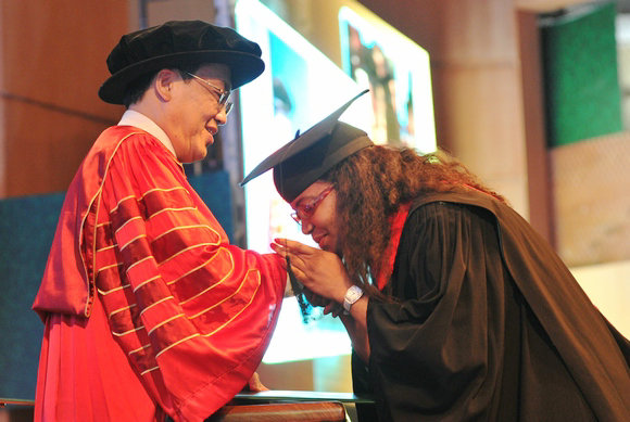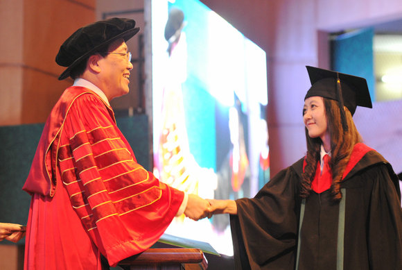 許寧生校長面帶微笑,站在授禮臺上,伸手與今年一萬多名畢業(yè)學(xué)子一一握手,并為每一位畢業(yè)學(xué)子頒授《學(xué)士(博士、碩士)學(xué)位授予儀式紀(jì)念冊》。對于學(xué)子們的各種自選動作,校長也一一配合,輕輕撥穗、溫暖擁抱、親切問候……都引起全場學(xué)子陣陣驚呼。