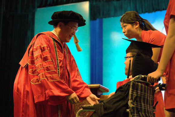 今天上午第二場畢業(yè)典禮為信息科學(xué)與工程學(xué)院畢業(yè)生頒授學(xué)位,因?yàn)榕∩?,這場畢業(yè)典禮被笑稱“漢子專場”。第一位受禮的學(xué)子坐在輪椅里,被禮儀工作人員推著上臺,校長從授禮臺上走下來,親切與他握手,并進(jìn)行了簡短的交談。這位學(xué)子就是信息科學(xué)與技術(shù)學(xué)院09級優(yōu)秀本科畢業(yè)生李乃琦。