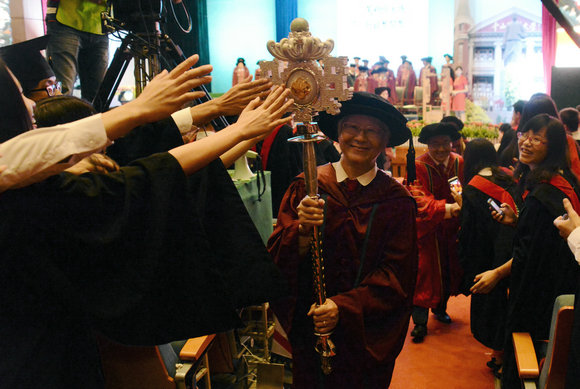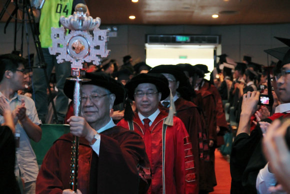 自1982年11月27日,我校舉行首批授予碩士、學(xué)士學(xué)位頒發(fā)證書典禮后,其形式和地點(diǎn)幾經(jīng)更易,最終于2007年形成如今的體制。那一年的典禮,不僅囊括了學(xué)位服和權(quán)杖兩個(gè)元素,更將宣讀中山先生畢業(yè)訓(xùn)詞作為一項(xiàng)必不可少的程序。當(dāng)日,康樂園齊聚本、碩、博約1萬多名畢業(yè)生,校長及主禮教授由權(quán)杖引導(dǎo)入場,校長莊嚴(yán)宣讀畢業(yè)訓(xùn)詞,讓畢業(yè)生聆聽最后一次教誨。