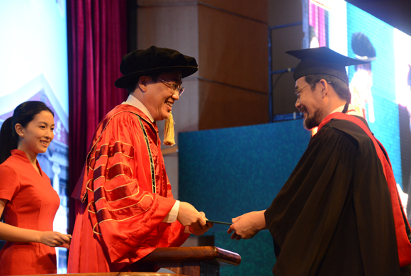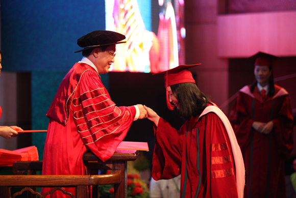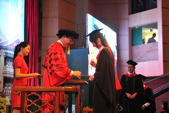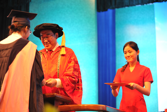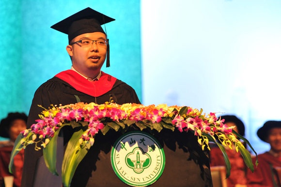 一位來自韓國的國際漢語學院畢業(yè)生吸引了觀眾的目光,他是全場年齡最大的畢業(yè)生金成坤,今年50歲,之前在韓國從事服裝生意,上大學一直是他的夢想。2007年來到廣州后,金成坤得以進入仰慕已久的中山大學學習,現(xiàn)在學業(yè)有成,他感到很驕傲。