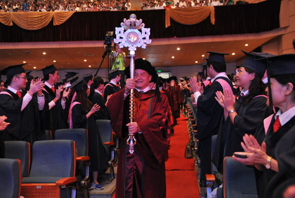 黃天驥教授是中文系1956屆畢業(yè)生,他回憶道,50年代也沒有畢業(yè)典禮,畢業(yè)的時候?qū)W校會舉行畢業(yè)聚餐。畢業(yè)后,他留校任教,親歷了畢業(yè)典禮的恢復與發(fā)展。他認為,畢業(yè)是人生的大事,莊嚴的畢業(yè)典禮能夠加深學生對畢業(yè)的重視。畢業(yè)典禮也是一個教育過程,同學們在儀式中受到愛校情操的感染;對老師本身也是教育,作為權杖執(zhí)掌人,黃天驥教授感覺很幸福。畢業(yè)典禮上學生穿學位袍、戴學位帽、和校長握手,時間雖然短暫,但校長與學生的握手凝聚了中大全體老師對畢業(yè)學子的祝愿。他希望大家要珍重這一時刻,自己走好將來的路,走出康莊大道。而不管走到哪里,中大的印記都將伴隨大家一生。