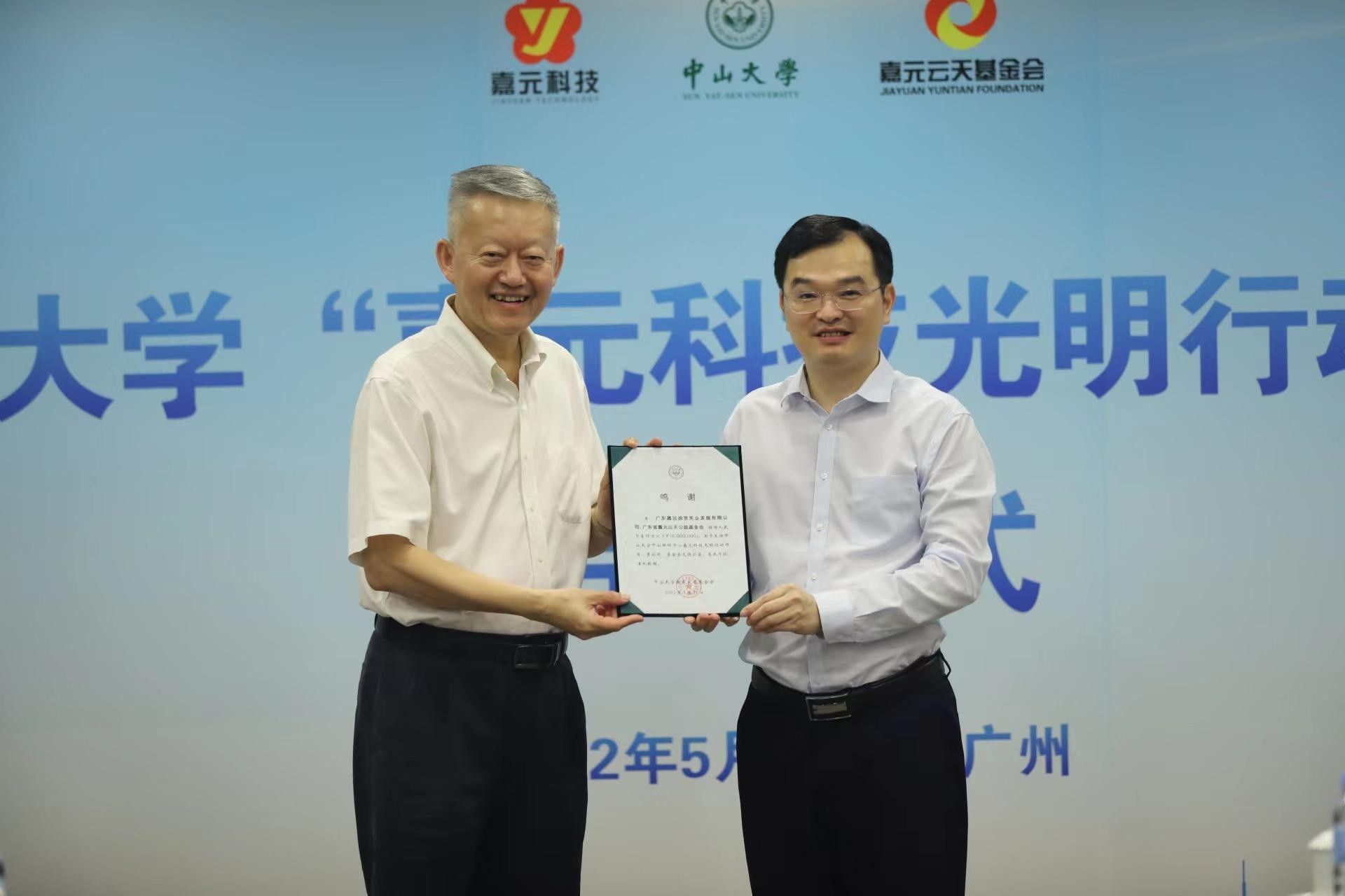 中山大學黨委書記陳春聲向嘉元科技董事長廖平元頒發(fā)鳴謝證書(來源:教育發(fā)展與校友事務(wù)辦公室)
