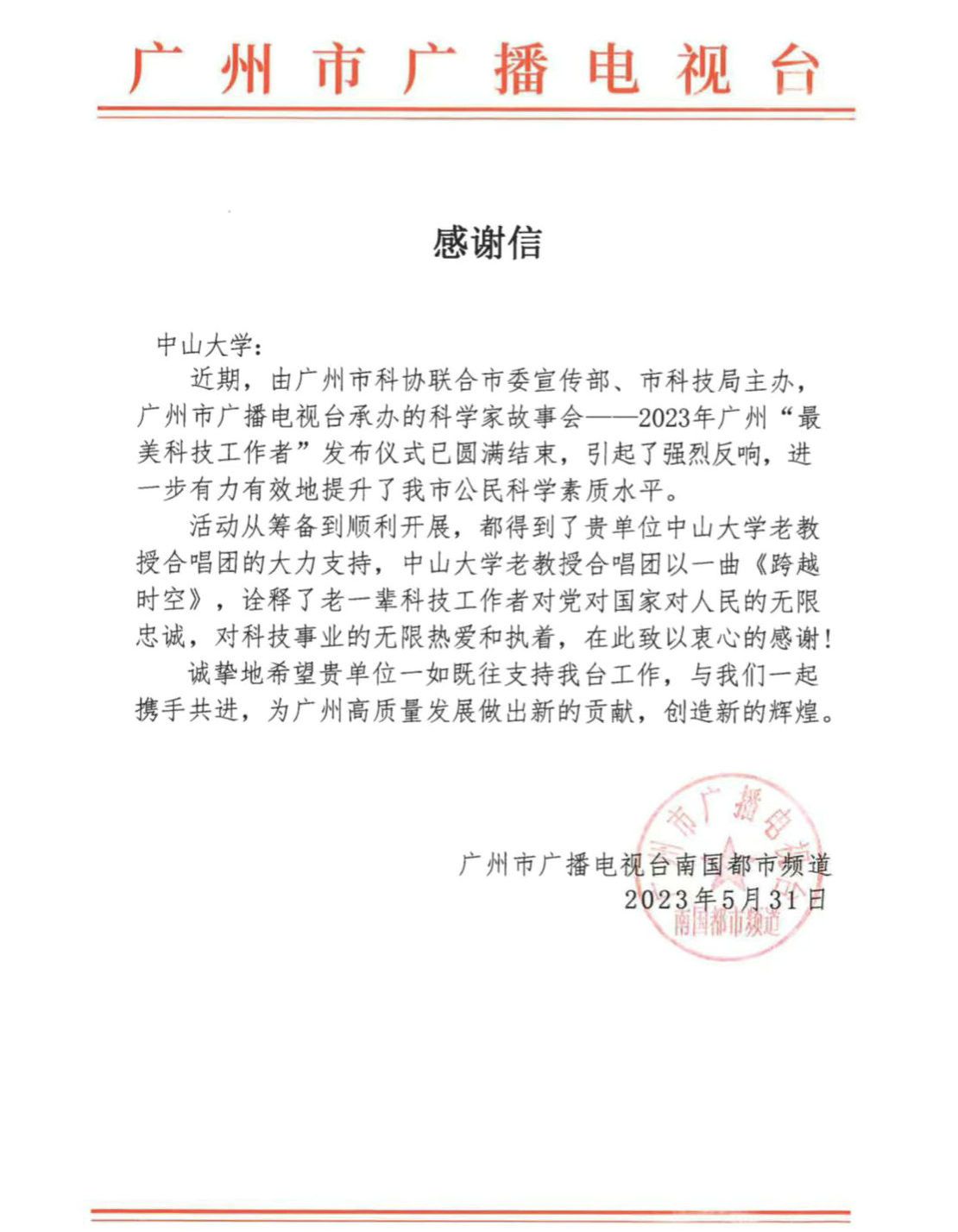 中大新聞網(wǎng)廣州6月1日電(通訊員彭波)5月30日,受廣州市廣播電視臺(tái)邀請(qǐng),中山大學(xué)老教授合唱團(tuán)選派團(tuán)員代表參加了科學(xué)家故事會(huì)——2023年廣州“最美科技工作者”發(fā)布儀式。老教授們的精彩表演獲得一致好評(píng),收到了廣州市廣播電視臺(tái)南國都市頻道發(fā)來的感謝信。