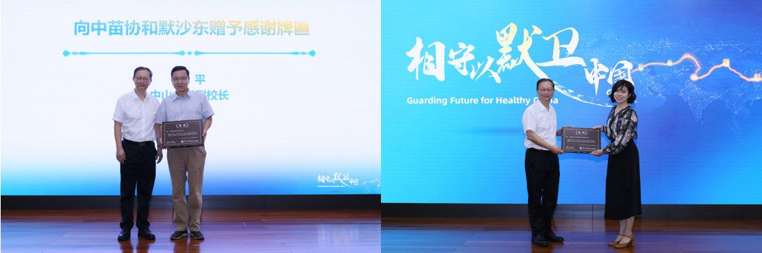 中山大學(xué)副校長蘭平向中苗協(xié)和默沙東贈予感謝牌匾
