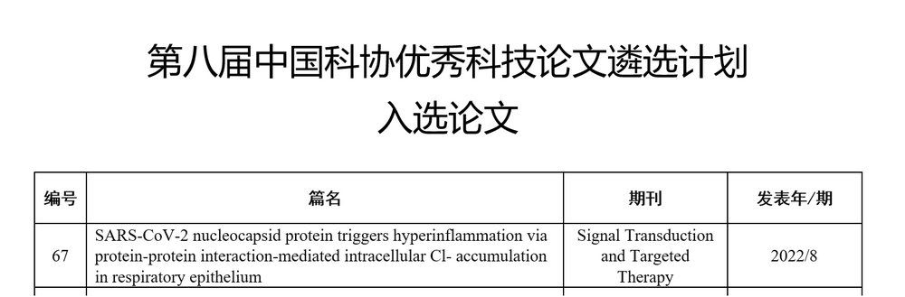 中大新聞網(wǎng)訊(通訊員張藝林)11月22日,中國(guó)科學(xué)技術(shù)協(xié)會(huì)(中國(guó)科協(xié))公布了第八屆優(yōu)秀科技論文遴選計(jì)劃入選論文。我校生命科學(xué)學(xué)院周文良/張藝林與鐘南山院士團(tuán)隊(duì)合作發(fā)表于自然出版集團(tuán)(NPG)旗下國(guó)際權(quán)威學(xué)術(shù)期刊《信號(hào)轉(zhuǎn)導(dǎo)與靶向治療(Signal Transduction and Targeted Therapy)》的封面論文“SARS-CoV-2 nucleocapsid protein triggers hyperinflammation via protein-protein interaction-mediated intracellular Cl? accumulation in respiratory epithelium”入選。