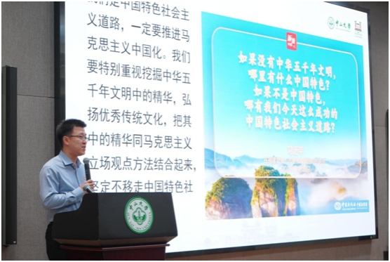 謝湜為中山大學(xué)習(xí)近平文化思想研習(xí)社做“拓展文明視野 建設(shè)文化強(qiáng)國(guó)”專(zhuān)題講座。他從領(lǐng)會(huì)習(xí)近平總書(shū)記關(guān)于文化傳承發(fā)展的重要論述、深入理解和把握中華文明的突出特性及價(jià)值內(nèi)涵、推動(dòng)中華優(yōu)秀傳統(tǒng)文化創(chuàng)造性轉(zhuǎn)化和創(chuàng)新性發(fā)展三個(gè)方面,帶領(lǐng)同學(xué)們系統(tǒng)學(xué)習(xí)習(xí)近平文化思想的核心要義和基本要求。他指出習(xí)近平文化思想重要的理論貢獻(xiàn)在于概括了中華文明的突出特性,塑造了中華民族的現(xiàn)代文明,其中中國(guó)式現(xiàn)代化為創(chuàng)造人類(lèi)文明新形態(tài)提供方案選擇。謝湜教授從我們黨大興調(diào)查研究之風(fēng)出發(fā),結(jié)合自身的歷史人類(lèi)學(xué)研究,鼓勵(lì)同學(xué)們要從國(guó)情出發(fā)、從實(shí)踐出發(fā),把論文寫(xiě)在祖國(guó)大地上,擔(dān)負(fù)起推動(dòng)文化繁榮、建設(shè)文化強(qiáng)國(guó)、建設(shè)中華民族現(xiàn)代文明的時(shí)代使命。