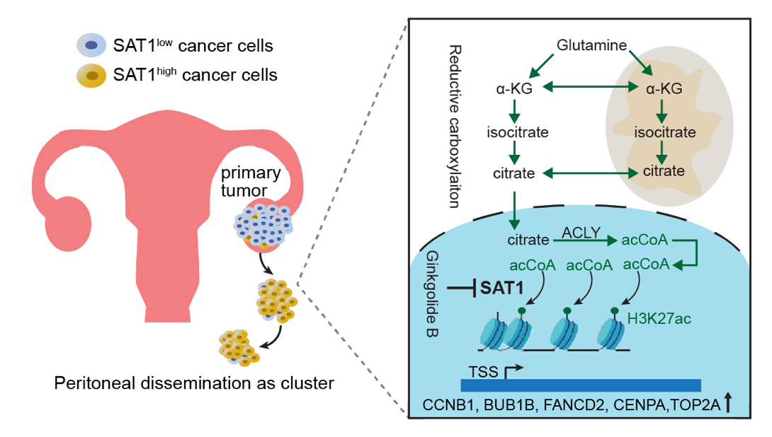 課題組研究發(fā)現(xiàn),低氧誘導(dǎo)SAT1高表達(dá),而SAT1通過(guò)促進(jìn)腫瘤細(xì)胞非錨定生存,進(jìn)而增強(qiáng)盆腹腔轉(zhuǎn)移。SAT1高表達(dá)的癌細(xì)胞在惡性腹水中普遍存在。SAT1通過(guò)直接乙?;薪z分裂關(guān)鍵調(diào)控基因的H3K27結(jié)構(gòu)域,提升其轉(zhuǎn)錄水平,進(jìn)而保護(hù)非錨定的轉(zhuǎn)移細(xì)胞免于有絲分裂災(zāi)難與細(xì)胞死亡。SAT1對(duì)H3K27的乙?;饔?,依賴于谷氨酰胺通過(guò)還原羧化途徑提供乙酰輔酶A。研究還發(fā)現(xiàn),藥食同源的天然產(chǎn)物銀杏內(nèi)酯B,可有效抑制SAT1活性,顯著降低小鼠模型中的轉(zhuǎn)移性腫瘤負(fù)荷。