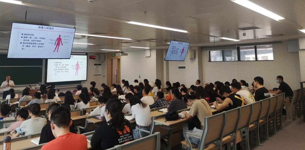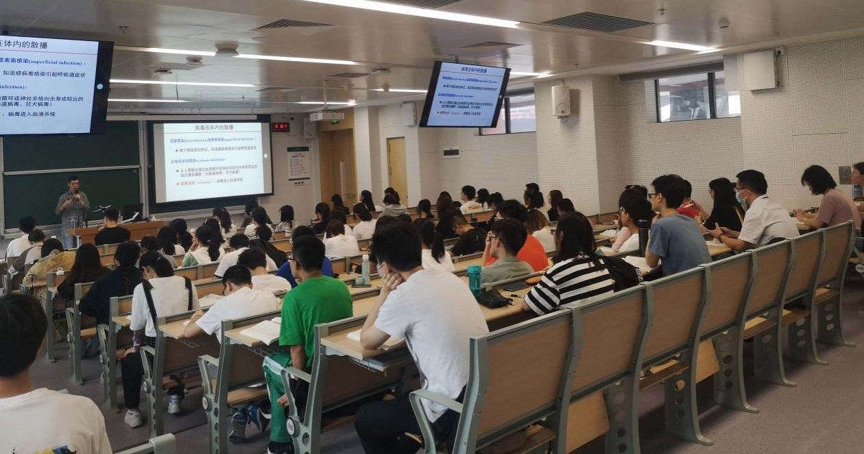 隨著課堂鈴聲響起,課程正式開始?!夺t(yī)學免疫學》授課老師醫(yī)學院陶鑫副教授播放了歌曲《山高水長》,將學生的學習激情點燃。學生們自發(fā)起立熱烈鼓掌致謝,并歡迎陶老師開啟久違的線下教學。《醫(yī)學微生物學》課程同時段兩個教學班分別有兩位授課老師,郭德銀教授以多年豐富的教學經(jīng)驗,充分調動了同學們學習的積極性和對學術的渴求;另一位授課老師施莽教授以生動的案例闡述人類健康和微生物特別是病毒的關系,牢牢抓住了學生們求知的心。