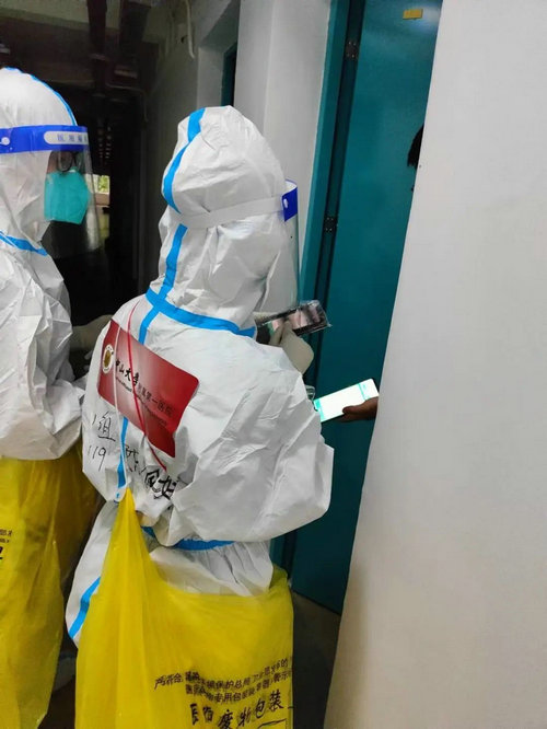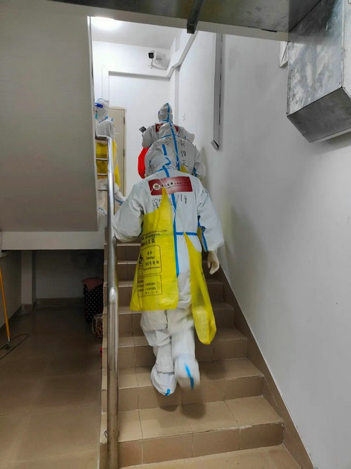 由于南校園實(shí)施“足不出戶”管理模式,隊(duì)員們需要“挨家挨戶”進(jìn)行上門采樣。有的宿舍樓層最高有8層,在29℃的天氣下,隊(duì)員們穿著密不透風(fēng)的防護(hù)服爬樓梯,汗流浹背,但大家心里想著師生平安健康,想著早點(diǎn)控制疫情,都毫無(wú)怨言。