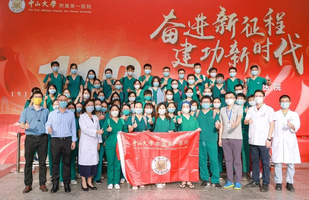中山一院50人核酸采樣醫(yī)療隊(duì)整裝待發(fā),趕赴中大南校園,醫(yī)務(wù)處劉大鉞處長(zhǎng)、肖良成副處長(zhǎng)參加出發(fā)儀式
