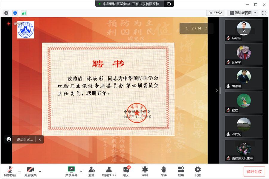 中大新聞網廣州12月6日電(通訊員周燕)11月30日,中華預防醫(yī)學會口腔衛(wèi)生保健專業(yè)委員會學術年會暨換屆會議以線上視頻方式順利召開。中山大學光華口腔醫(yī)學院·附屬口腔醫(yī)院林煥彩教授當選中華預防醫(yī)學會第四屆口腔衛(wèi)生保健專業(yè)委員會主任委員。