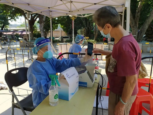 在海珠區(qū)這場疫情中,退休致公黨黨員戴建子奮戰(zhàn)在抗疫第一線。作為沙園巾幗藝術志愿服務隊的一員,她主要在沙園街道核酸檢測點負責引導居民、維持秩序,并且還學會了使用核酸檢測掃碼錄入信息的功能。幫助不懂使用智能手機的長者操作核酸碼、為行動不便的長者推輪椅、攙扶腿腳不便的長者完成核酸檢測……她將滿分的熱情投入到每次服務中。
