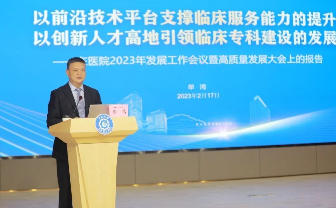 會(huì)上,單鴻院長圍繞“以前沿技術(shù)平臺(tái)支撐臨床服務(wù)能力的提升 以創(chuàng)新人才高地引領(lǐng)臨床??平ㄔO(shè)的發(fā)展”作主題報(bào)告。報(bào)告明確了醫(yī)院高質(zhì)量發(fā)展的內(nèi)涵與要求:醫(yī)療服務(wù)能力、專科建設(shè)水平、人才隊(duì)伍素養(yǎng)、科學(xué)研究能力、管理服務(wù)效能都得到“量”的飛躍和“質(zhì)”的提升。單鴻院長指出,要充分發(fā)揮先進(jìn)醫(yī)療技術(shù)對(duì)臨床專科的支撐作用,不斷提升醫(yī)療服務(wù)能力;要推動(dòng)構(gòu)建總量適度、規(guī)模合理、梯隊(duì)完善的人才隊(duì)伍,不斷引育拔尖醫(yī)學(xué)人才,打造創(chuàng)新人才高地;要強(qiáng)化考核評(píng)價(jià)體系建設(shè),著力建設(shè)高水平平臺(tái),催生高質(zhì)量科學(xué)研究成果;要完善醫(yī)院運(yùn)營管理評(píng)價(jià)體系建設(shè),不斷提升內(nèi)部治理能力;要將高質(zhì)量發(fā)展、高水平醫(yī)院建設(shè)、一流大學(xué)附屬醫(yī)院建設(shè)有機(jī)結(jié)合,以珠澳轉(zhuǎn)化醫(yī)學(xué)中心及珠澳轉(zhuǎn)化醫(yī)學(xué)研究院建設(shè)和“三甲”復(fù)審為契機(jī),不斷構(gòu)建新體系,提升新效能,激活新動(dòng)力。全體五院人要堅(jiān)持以習(xí)近平新時(shí)代中國特色社會(huì)主義思想為指導(dǎo),團(tuán)結(jié)一心加油干,以釘釘子精神狠抓落實(shí),苦干實(shí)干,勇于擔(dān)當(dāng),為人民健康事業(yè),為學(xué)?!半p一流”建設(shè),跑出“五院加速度”。