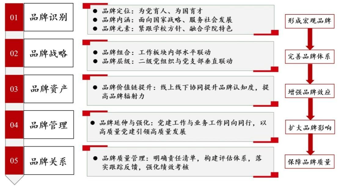 學院基于管理學中品牌建設的相關理論,形成“紅色微電”品牌的“創(chuàng)建全流程模式”?!捌放苿?chuàng)建全流程模式”主要分為五個階段,分別為品牌識別、品牌戰(zhàn)略、品牌資產(chǎn)、品牌管理和品牌關系,逐步推進品牌文化的深入落實。