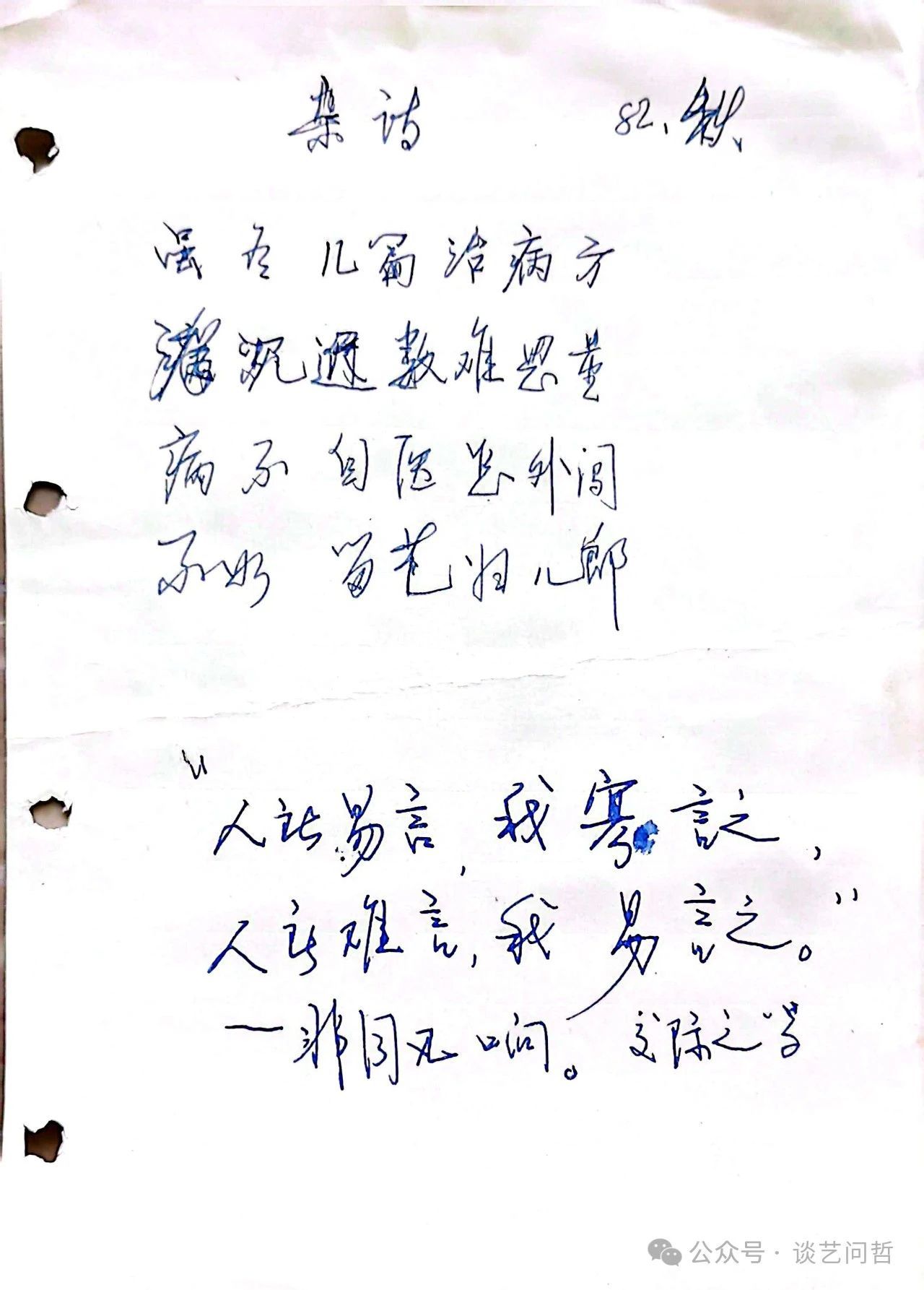 在嚴(yán)酷的生活現(xiàn)實(shí)面前,父親往往選擇“隱忍”,這不是對(duì)人生的妥協(xié),而是一種積極的策略調(diào)整。父親經(jīng)常抄錄《孟子·盡心上》的一段名言,所謂“窮則獨(dú)善其身,達(dá)則兼善天下”,這正是父親持守的人生信條。1980年代初,父親教學(xué)業(yè)績(jī)突出而遭遇工作中的某些“不公”,因作五言《答勸事》云: