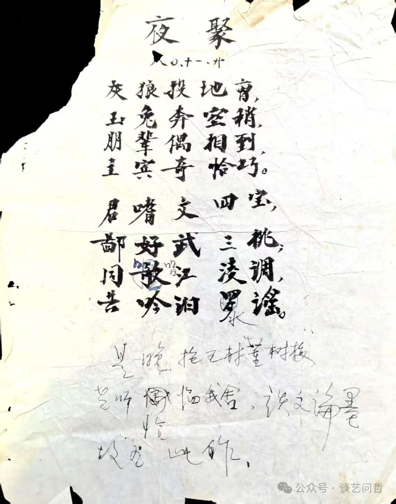 原來,父親是給我們現(xiàn)場(chǎng)出題作文,其意一在鍛煉寫作,二在涵養(yǎng)德性,培育志向。三人現(xiàn)場(chǎng)各有撰作,雖甚粗疏,然獲此庭訓(xùn),誠(chéng)吾輩之幸也!今年寒假,在珠海博雅苑整理父親遺稿,得以檢出1980年父親與鄰村同事董樹梅老師等人的酬唱詩(shī)作數(shù)則,乃是冬日夜晚到吾村看電影后父親邀來我家的雅集之作。雖不甚工,卻也有趣。至于今日,我依然覺得在貧寒鄉(xiāng)村能有如此文雅之舉,是父親具有高邁文化品格的生動(dòng)體現(xiàn),也是“文在鄉(xiāng)野”的有力明證,我要向先君致以崇高敬意!