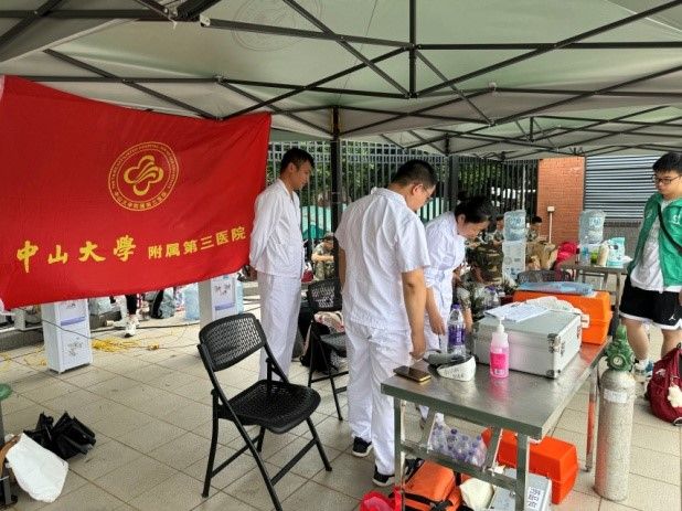 在西大球場的烈日下,中山大學(xué)附屬第一醫(yī)院、孫逸仙紀(jì)念醫(yī)院、附屬第三醫(yī)院及附屬第六醫(yī)院的醫(yī)療團(tuán)隊(duì)輪流值守,時(shí)刻準(zhǔn)備為軍訓(xùn)中感到不適的學(xué)生提供及時(shí)的醫(yī)療服務(wù)。而在另一側(cè)的英東田徑場,南校園門診部則以其一貫的堅(jiān)守與奉獻(xiàn),持續(xù)為軍訓(xùn)新生提供全天候的醫(yī)療保障服務(wù)?,F(xiàn)場均配備了專業(yè)的急救設(shè)備和充足的藥品,確保能夠在第一時(shí)間對(duì)突發(fā)狀況進(jìn)行有效處理,減輕學(xué)生的痛苦,穩(wěn)定病情。