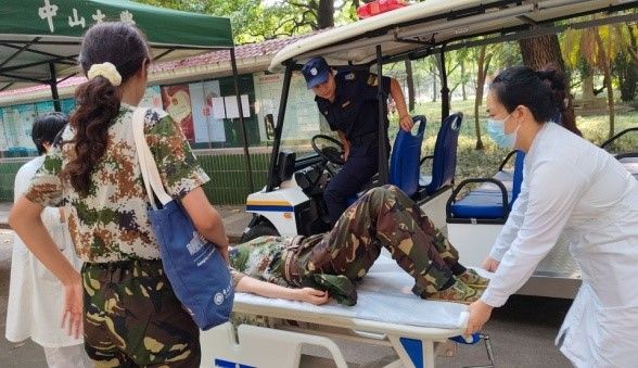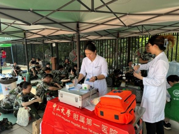 全體醫(yī)護(hù)人員們以滿腔的熱情與專業(yè)的態(tài)度,穿梭于訓(xùn)練場與醫(yī)療站點(diǎn)之間,用實(shí)際行動(dòng)詮釋了“醫(yī)者仁心”的深刻內(nèi)涵。從簡單的擦傷到復(fù)雜的急癥,每一份不適都被他們細(xì)心記錄,妥善處理,確保學(xué)生能夠在安全、健康的狀態(tài)下環(huán)境中完成軍訓(xùn)任務(wù)。更為貼心的是,當(dāng)遇到需要緊急救治或進(jìn)一步治療的情況時(shí),醫(yī)療團(tuán)隊(duì)會(huì)迅速啟動(dòng)應(yīng)急預(yù)案,由保衛(wèi)處接應(yīng)學(xué)生,醫(yī)護(hù)人員通過救護(hù)車將學(xué)生安全轉(zhuǎn)診至醫(yī)院急診科,確保學(xué)生得到及時(shí)、專業(yè)的救治。這一系列舉措,彰顯了中山大學(xué)醫(yī)療系統(tǒng)的強(qiáng)大實(shí)力與深厚底蘊(yùn),也是各附屬醫(yī)院團(tuán)結(jié)協(xié)作的生動(dòng)寫照。