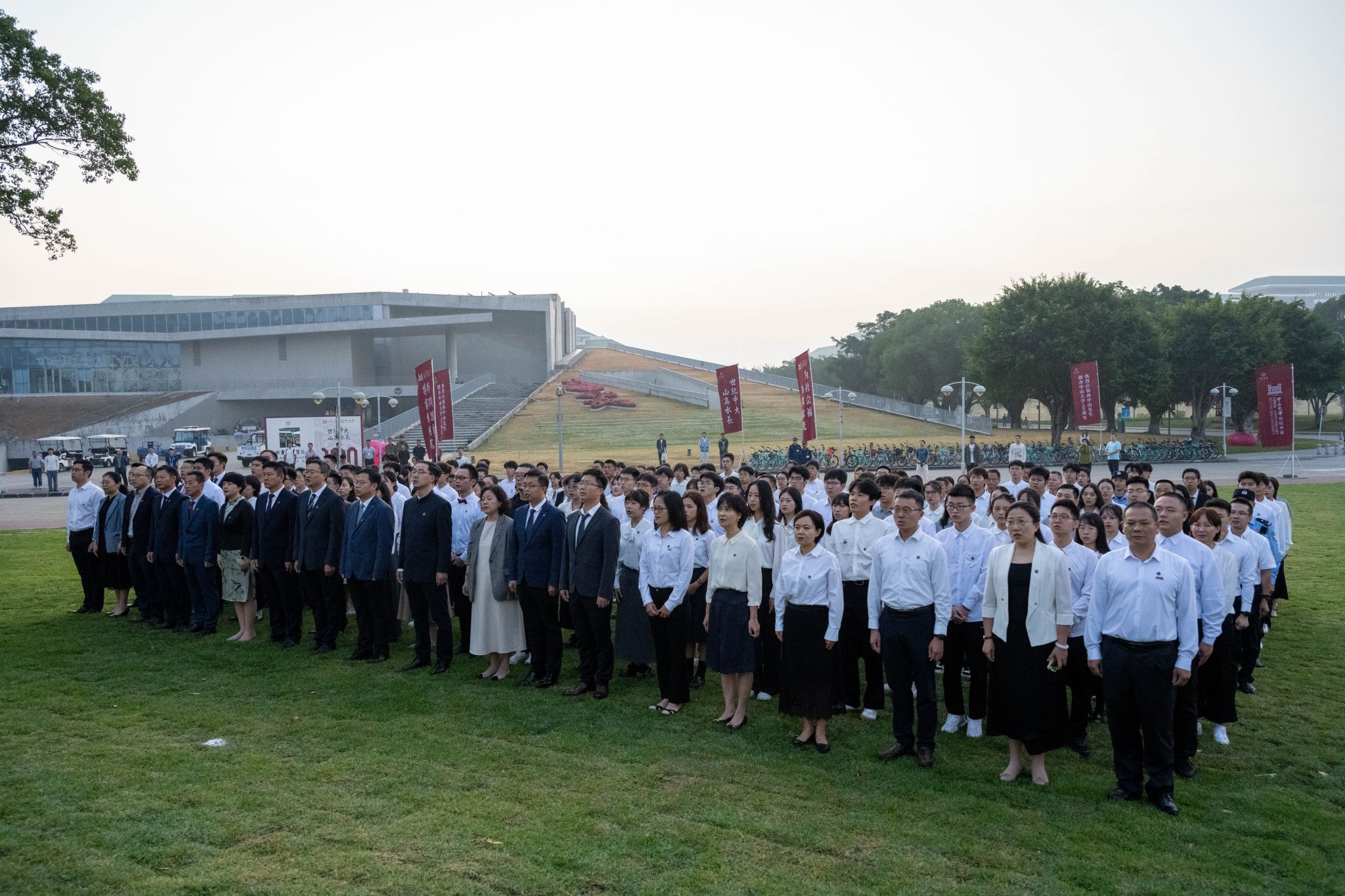 陽光明媚,秋意盎然。伴隨著莊嚴的國歌與激昂的校歌旋律,五星紅旗與中山大學校旗依次緩緩升起,在秋風中獵獵作響,全場師生共同肅立,投以莊重而充滿敬意的目光,氛圍莊嚴而神圣。