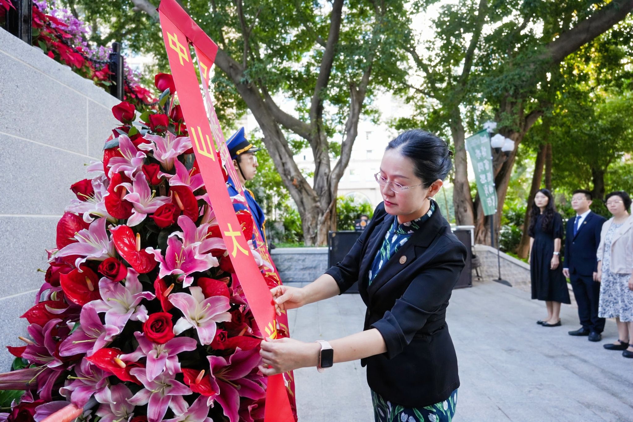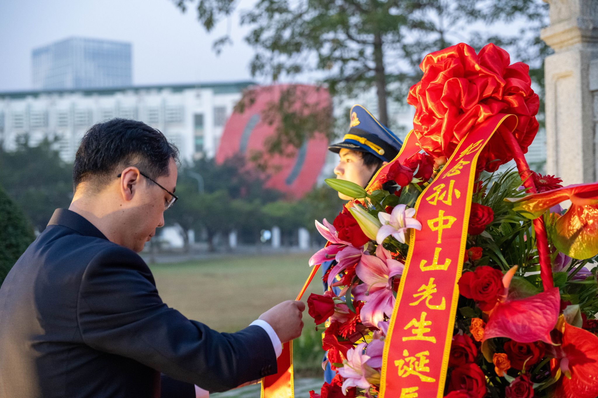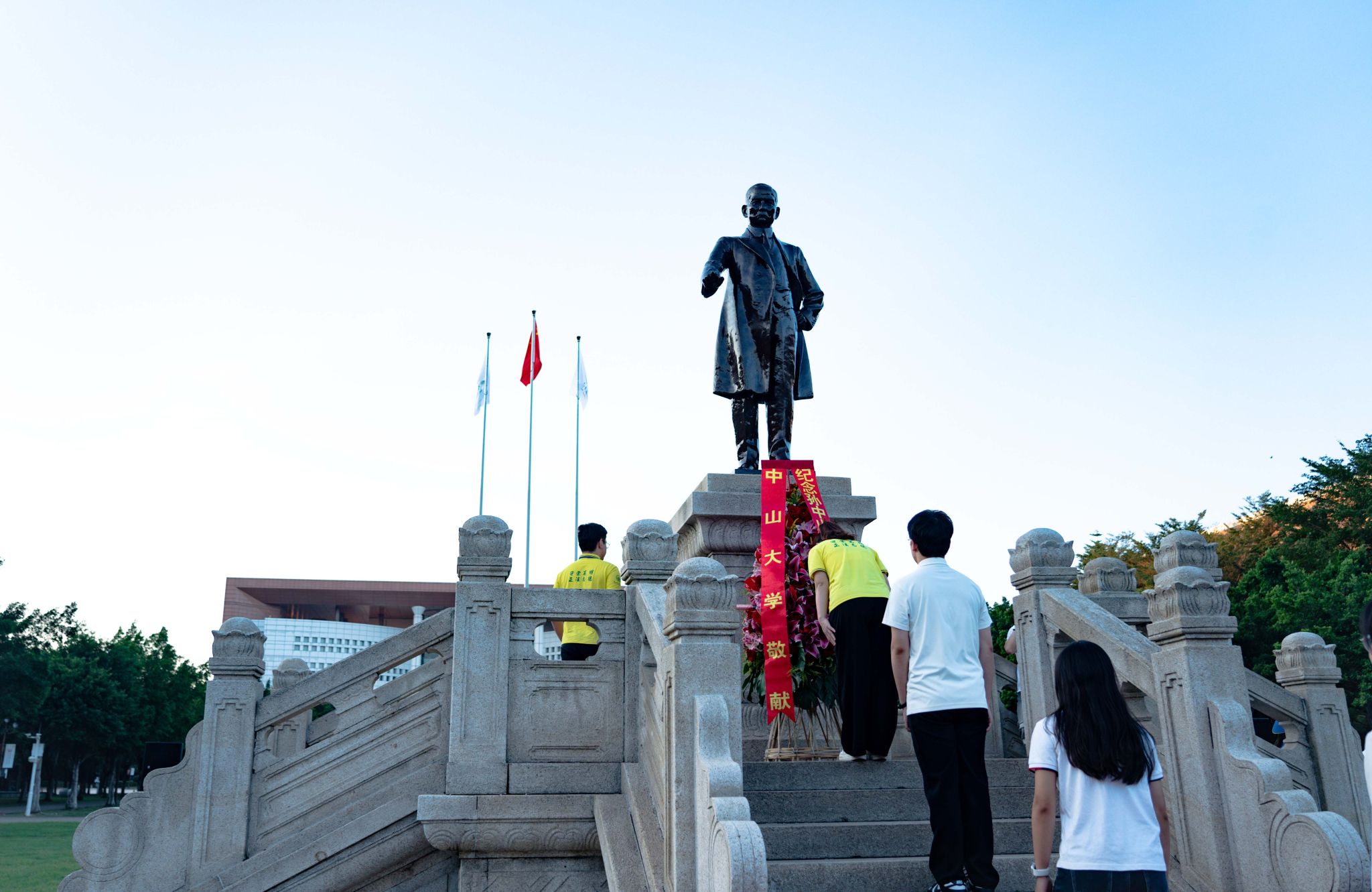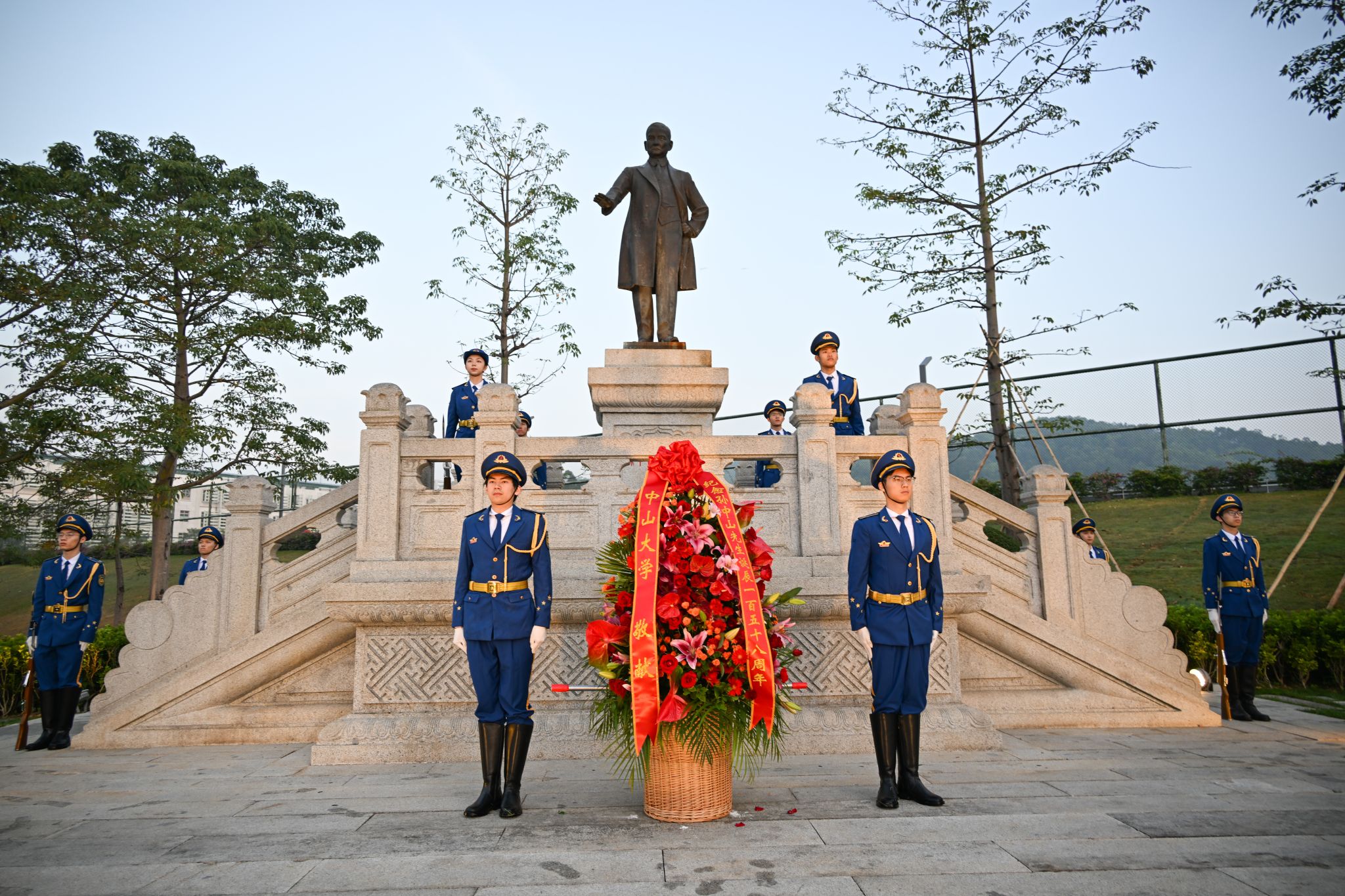 升旗儀式后,敬獻花籃曲響起,國旗班代表將花籃穩(wěn)步抬至孫中山先生銅像基座前。主禮校領導緩步上前,仔細整理花籃緞帶。紅色緞帶上印著“紀念孫中山先生誕辰一百五十八周年”,寄托了全體中大人對中山先生的深切緬懷和崇高敬意。隨后,全體人員向中山先生銅像行鞠躬禮。主禮校領導帶領在場師生代表肅穆繞行,瞻仰先生銅像。