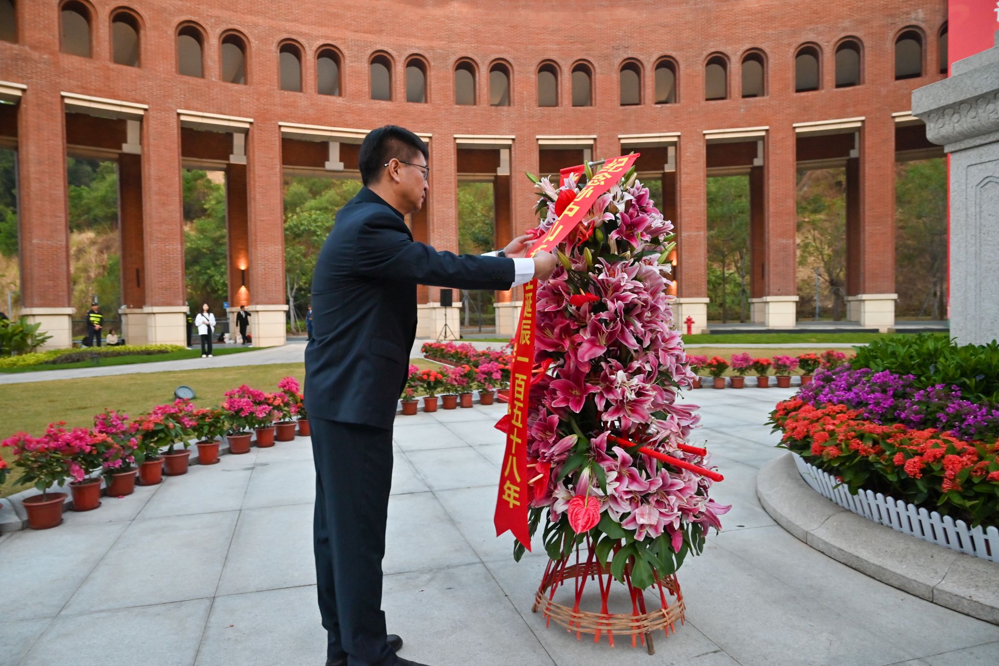 校黨委書記朱孔軍、校長高松,校黨委副書記張琪,副校長劉濟科,副校長鄭躍,副校長邰忠智分別在五個校區(qū)(園)主禮獻花儀式,向孫中山先生致敬,為中山大學慶生。學校黨委副書記國亞萍,醫(yī)學部綜合管理處處長龍波,東校園管理委員會李明章主任,珠海校區(qū)管理委員會劉梅主任,深圳校區(qū)管委會溫光浩常務副主任分別主持了廣州校區(qū)南校園、北校園、東校園,珠海校區(qū)和深圳校區(qū)的儀式。學校全體校領導,各職能部門、院系及附屬單位負責人和師生代表參加儀式。
