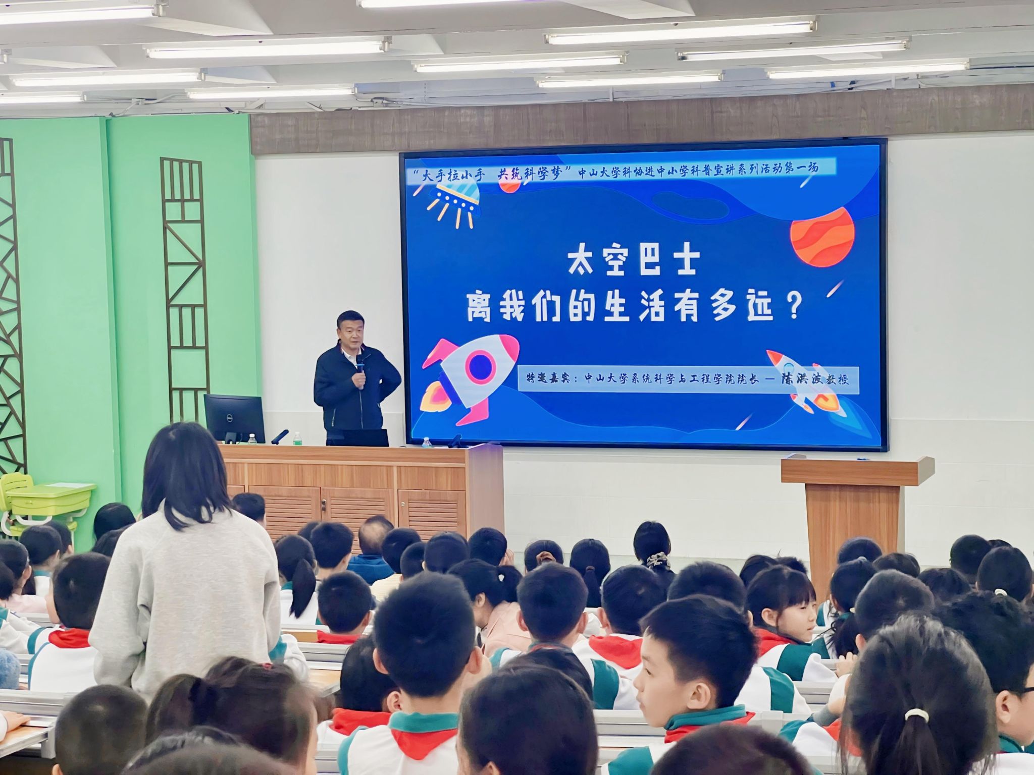 3月19日下午,首場講座在中山大學附屬小學開展,系統(tǒng)科學與工程學院院長陳洪波教授以“太空巴士離我們的生活有多遠”為主題開講。
