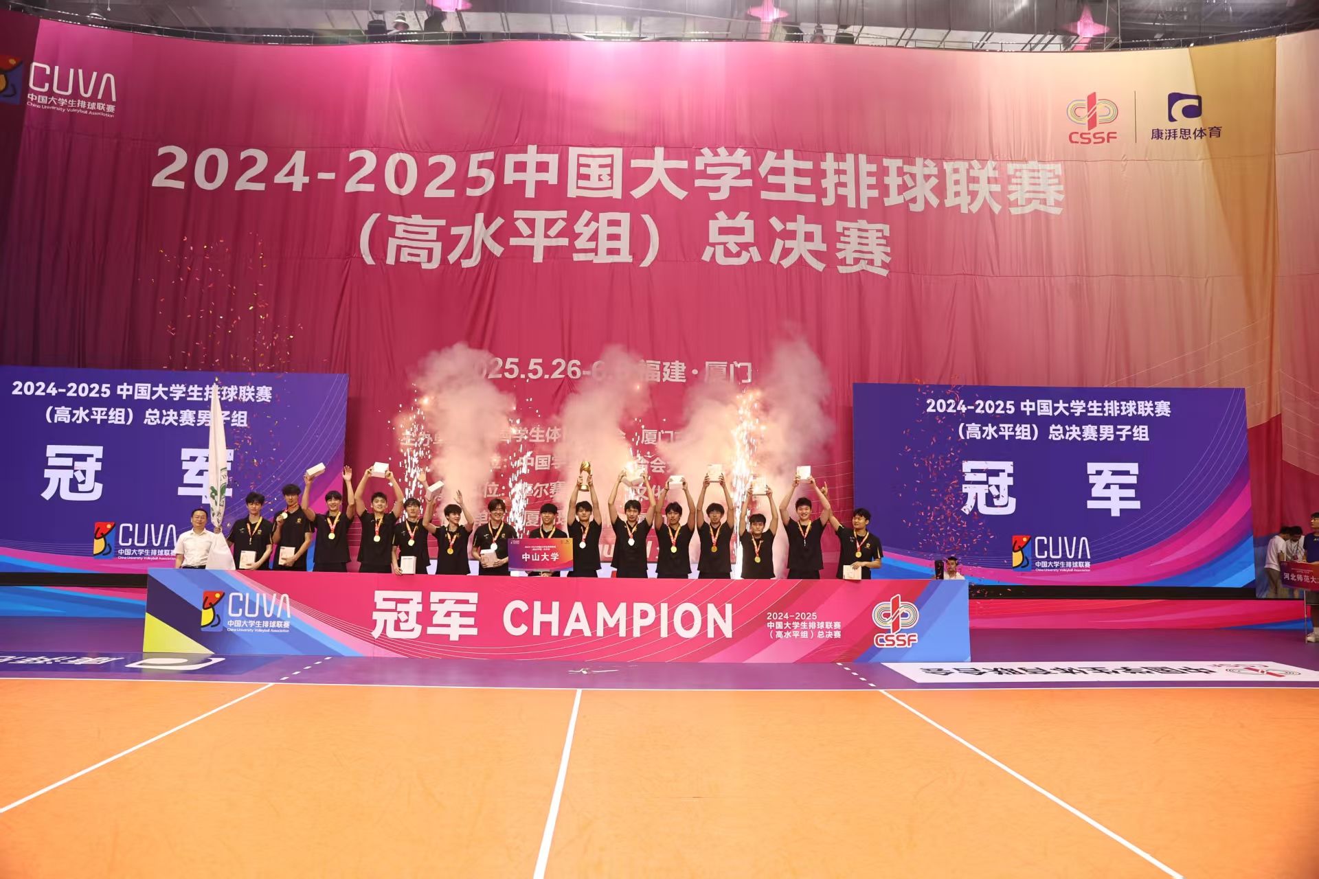 中大新聞網(wǎng)訊(通訊員姚頌華)6月5日,2024-2025中國(guó)大學(xué)生排球聯(lián)賽(高水平組)總決賽在廈門(mén)理工學(xué)院集美校區(qū)落下帷幕。中山大學(xué)男子排球隊(duì)在教練員李潤(rùn)銘、劉思華、單建功的指導(dǎo)下,在男子組決賽中以3:0戰(zhàn)勝南昌大學(xué)隊(duì),成功衛(wèi)冕全國(guó)總冠軍,實(shí)現(xiàn)"雙冠王"的歷史性突破。
