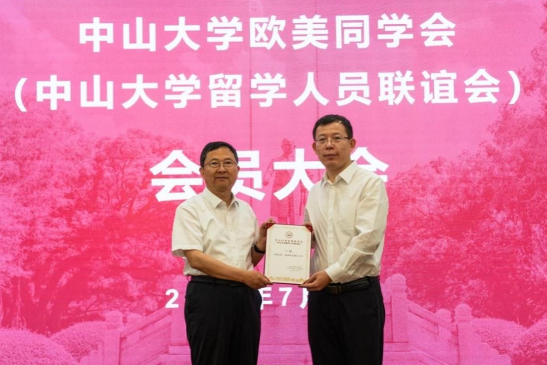 中山大學(xué)校長(zhǎng)、廣東歐美同學(xué)會(huì)會(huì)長(zhǎng)高松為新一屆理事會(huì)執(zhí)行會(huì)長(zhǎng)王猛教授(右)頒發(fā)證書(shū) 黨委宣傳部張楚翊攝
