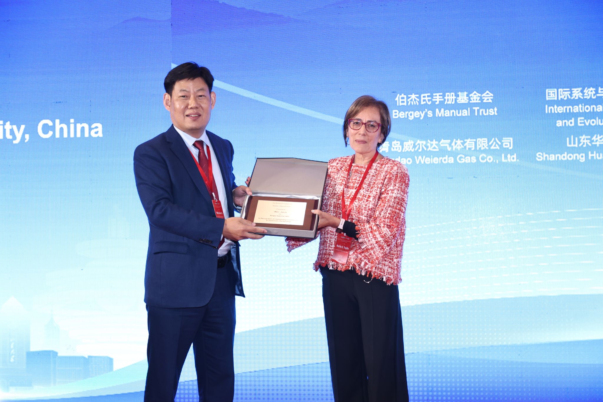 伯杰氏手冊基金會(Bergey's Manual Trust)主席、《國際系統(tǒng)與進化微生物學雜志》(International Journal of Systematic and Evolutionary Microbiology)主編Martha E. Trujillo教授(右)為李文均教授頒獎