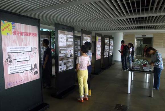 展覽通過實物展和微博展兩種形式展開。實物展位于東校區(qū)圖書館的三樓中庭,包括海報及污損圖書實物展示,吸引了眾多同學駐足瀏覽,留言欄上留下了上百條留言。3月26日,數(shù)百位來自全國各地的圖書館館長及工作人員到我館交流,也到場觀看了展覽,均對展覽給予了一致的贊賞,紛紛拍下照片,表示要把好的工作經(jīng)驗帶回其圖書館內研究。