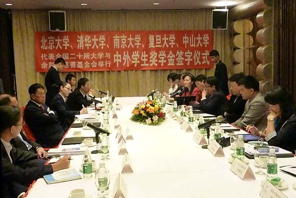4月17日上午,我校黨委副書記、教育發(fā)展基金會副理事長李萍,教育發(fā)展與校友事務辦公室主任、教育發(fā)展基金會秘書長李漢榮一行赴深圳,與余彭年慈善基金會簽署關于設立“中山大學彭年外國留學生獎勵金”的捐贈協(xié)議。北京大學、清華大學、復旦大學、南京大學、中山大學等國內五所高校參加了此次捐贈儀式。