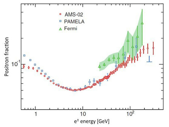 過去幾十年內(nèi),粒子物理與天文物理學(xué)家對初級宇宙射線中的正電子分率極感興趣,其背后的原因是:通過測量正電子與電子之比率并研究在全能譜中任何正電子過量的現(xiàn)象,對暗物質(zhì)的來源及其它物理現(xiàn)象可以有更好的了解。AMS第一結(jié)果的精確度及可用的高統(tǒng)計量,突顯了其正電子分率有別于先前其他實驗的報導(dǎo)。未來AMS在積累更多的、特別是高能量的實驗數(shù)據(jù)后,高能域的數(shù)據(jù)統(tǒng)計誤差下降,可以看到在此能域能譜是否存在截止,由此判斷“多出的”正電子此能譜到底是源于暗物質(zhì)之碰撞還是星系中的脈沖星。