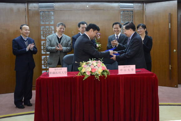 2月26日上午,新疆醫(yī)科大學(xué)哈木拉提?吾甫爾校長一行來訪我校。鄭德濤書記與來賓進(jìn)行了會晤,雙方還簽署了《新疆醫(yī)科大學(xué)與中山大學(xué)聯(lián)合培養(yǎng)學(xué)生(七年制)項(xiàng)目協(xié)議書》,就人才培養(yǎng)進(jìn)行深入合作。我校醫(yī)學(xué)教務(wù)處處長肖海鵬、南方學(xué)院院長謝富康(2005年赴新疆醫(yī)科大學(xué)援教,任副校長)等出席了簽約儀式。