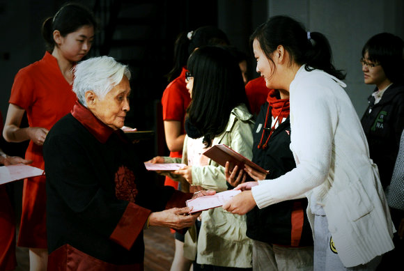 沈祖榮先生之女沈?qū)氭屡繛楂@獎(jiǎng)學(xué)生頒獎(jiǎng)