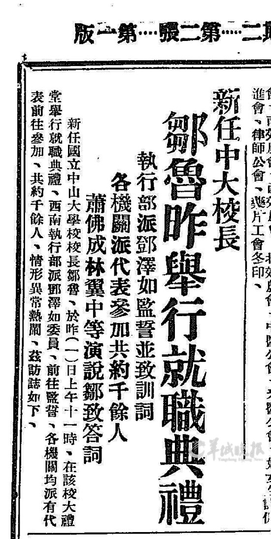 2月1日,中大舉行校長就職典禮,上午11點校鐘長鳴,2000名學(xué)生和剛剛在省府禮堂向西南執(zhí)政部委員報告十九路軍上??谷涨樾魏蟠掖亿s來的鄒魯及一批官員進(jìn)入大禮堂。在典禮上,鄒魯舉右手宣誓,從前任校長許崇清手上接過大印,他說:“總理(指孫中山)創(chuàng)辦這間大學(xué)的時候,正當(dāng)軍事倥傯、環(huán)境困難的中華民國十二年,那里外有帝國主義的壓迫,在內(nèi)除廣州外皆是敵人,總理不避艱苦,就在這個時機(jī)來創(chuàng)辦這大學(xué),他的立意是很遠(yuǎn)大的。……現(xiàn)在,暴日肆虐,國難當(dāng)前。在這個抗日當(dāng)中,有許多學(xué)校的學(xué)生完全沒有上課,專做那口頭上的工作,這是無濟(jì)于事的。我們試觀現(xiàn)代的戰(zhàn)爭,完全是科學(xué)的斗爭,如果自己的知識階級不努力于科學(xué)的研究,那么我們的救國目的也是渺渺前途,沒有成功之希望的。所以我們的學(xué)生在這國家危急存亡之秋,應(yīng)當(dāng)加緊工作、加倍努力!”