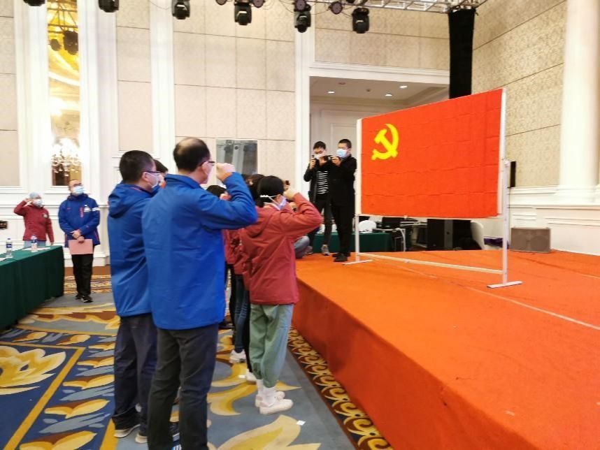 2020年,武漢“戰(zhàn)疫”前線,孫逸仙紀(jì)念醫(yī)院84位援鄂醫(yī)療隊(duì)員提交了入黨申請(qǐng)書,54人火線入黨,圖為援鄂醫(yī)療隊(duì)火線入黨宣誓儀式